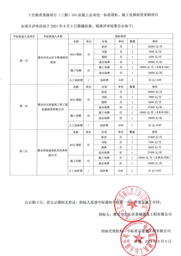 十里梅香茶源項(xiàng)目(三期)164畝施工總承包一標(biāo)段塔機(jī)、施工電梯租賃采購中標(biāo)公示