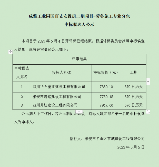 成雅工業(yè)園區(qū)百丈安置房二期項目-勞務(wù)施工專業(yè)分包中標候選人公示
