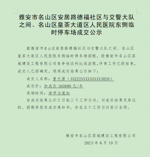 雅安市名山區(qū)安居路德福社區(qū)與交警大隊(duì)之間、名山區(qū)皇茶大道區(qū)人民醫(yī)院東側(cè)臨時(shí)停車場(chǎng)成交公示